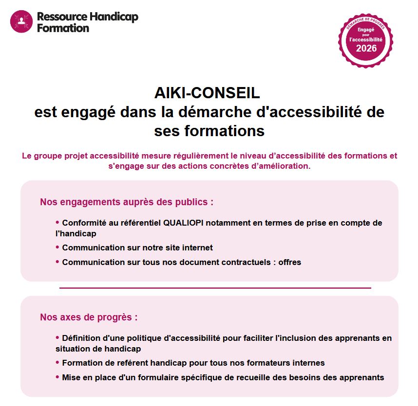 Afin de faire évoluer durablement nos pratiques et afin de rendre nos formations professionnelles accessibles aux personnes en situation de handicap. Nous adaptons les modalités de la formation à votre handicap. Vous trouverez ci-dessous la fiche accessibilité et compensation à nous renvoyer complétées le cas échéant.